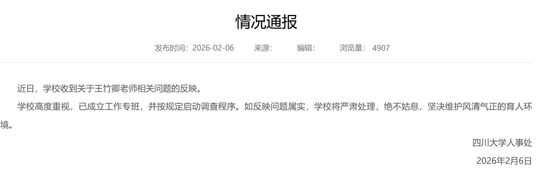 近日,有网友发帖称,四川大学教师王竹卿存在学术不端、辱骂学生等问题。