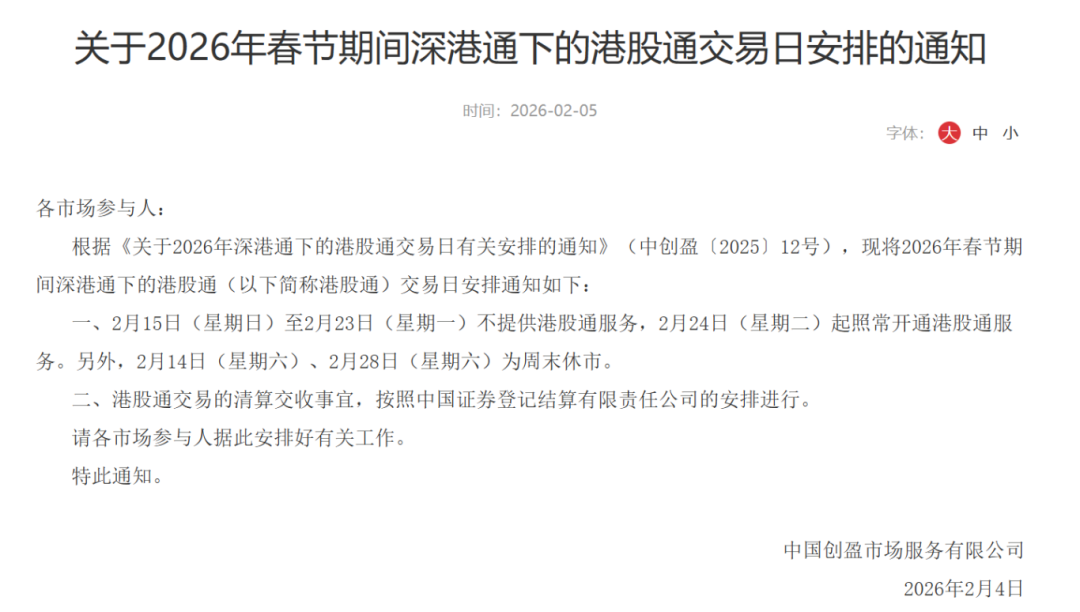 2026年春节期间深港通下的港股通(以下简称港股通)交易日安排通知如下: