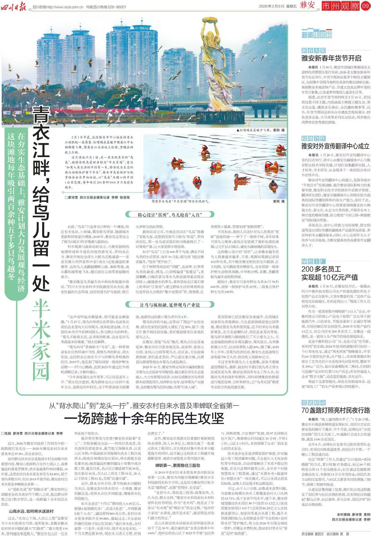 值得一提的是,四川日报市州观察也在两会期间强势推出,整版亮相,从城市观鸟经济、农民自来水普及的民生攻坚等角度,生动展现雅安的工作成效,《青衣江畔,给鸟儿留一处“半米家园”》还获得了人民日报新媒体的转载。