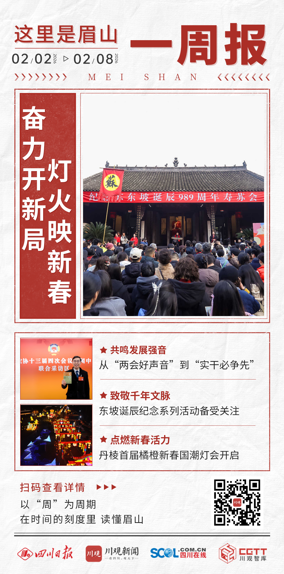2026年第六周(2月2日—2月8日),眉山在省两会上激荡奋进信心,在千年文脉传承中感受历史温度,也在璀璨灯火的映照下绽放城市烟火。