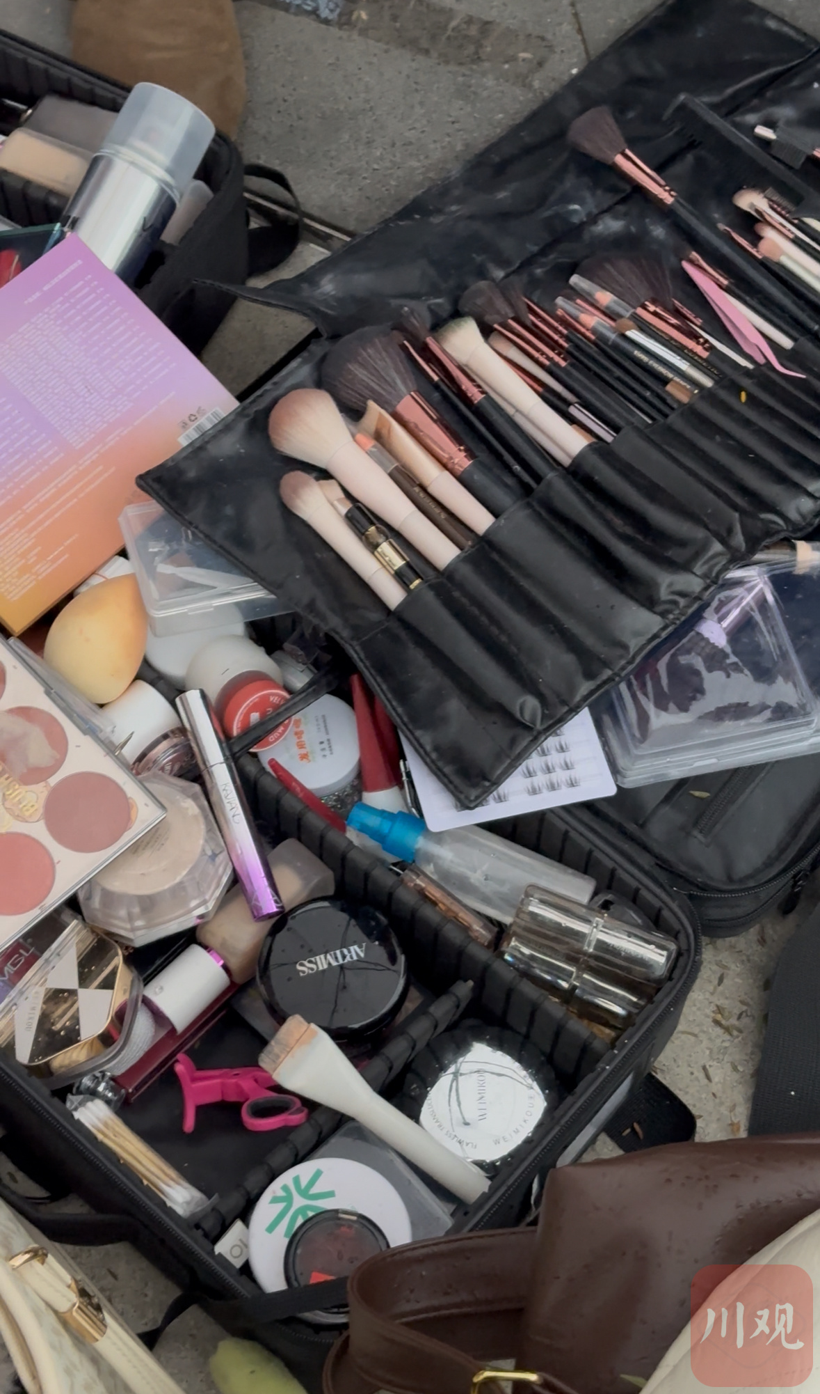 化妆师摊位前的化妆品。