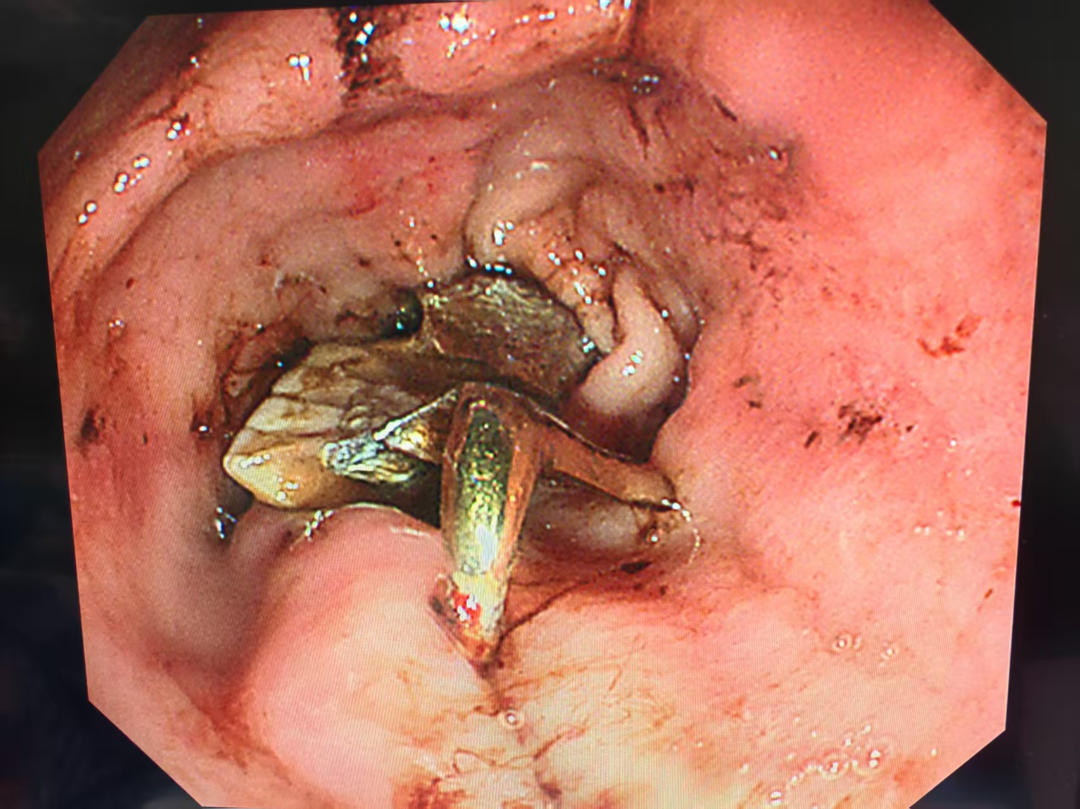 手术室里,胃镜缓缓进入,显示屏上清晰可见,假牙一端已经嵌进了胃黏膜。整个过程就像在食管里“绣花”,需万分小心,手术团队用异物钳小心翼翼地拨动假牙,并用无菌手套自制了一个“保护套”,整体套住假牙和尖钩,防止取出假牙时损伤食管曲张静脉。半小时后,假牙终于被完整取出。