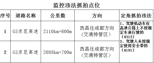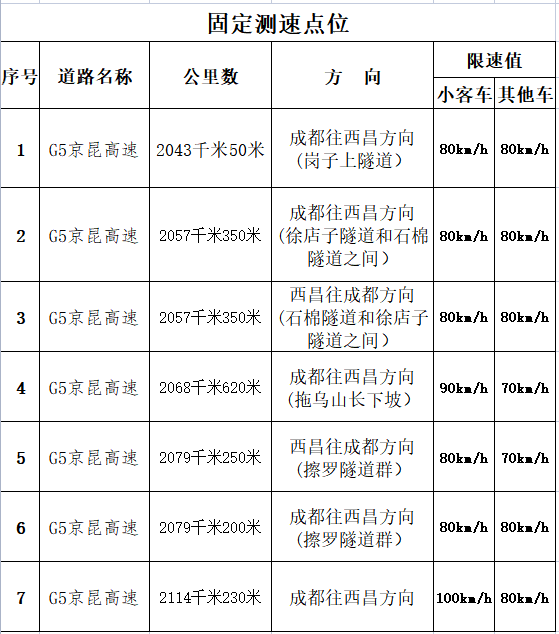 日前,四川高速公安六分局根据相关要求,已完成对G05京昆高速(雅西段)限速标志标牌更新和监控设备调整。现将G05京昆高速(雅西段)2036Km至2115km路段限速变更后,重新公示辖区现有交通技术监控设备如下:
