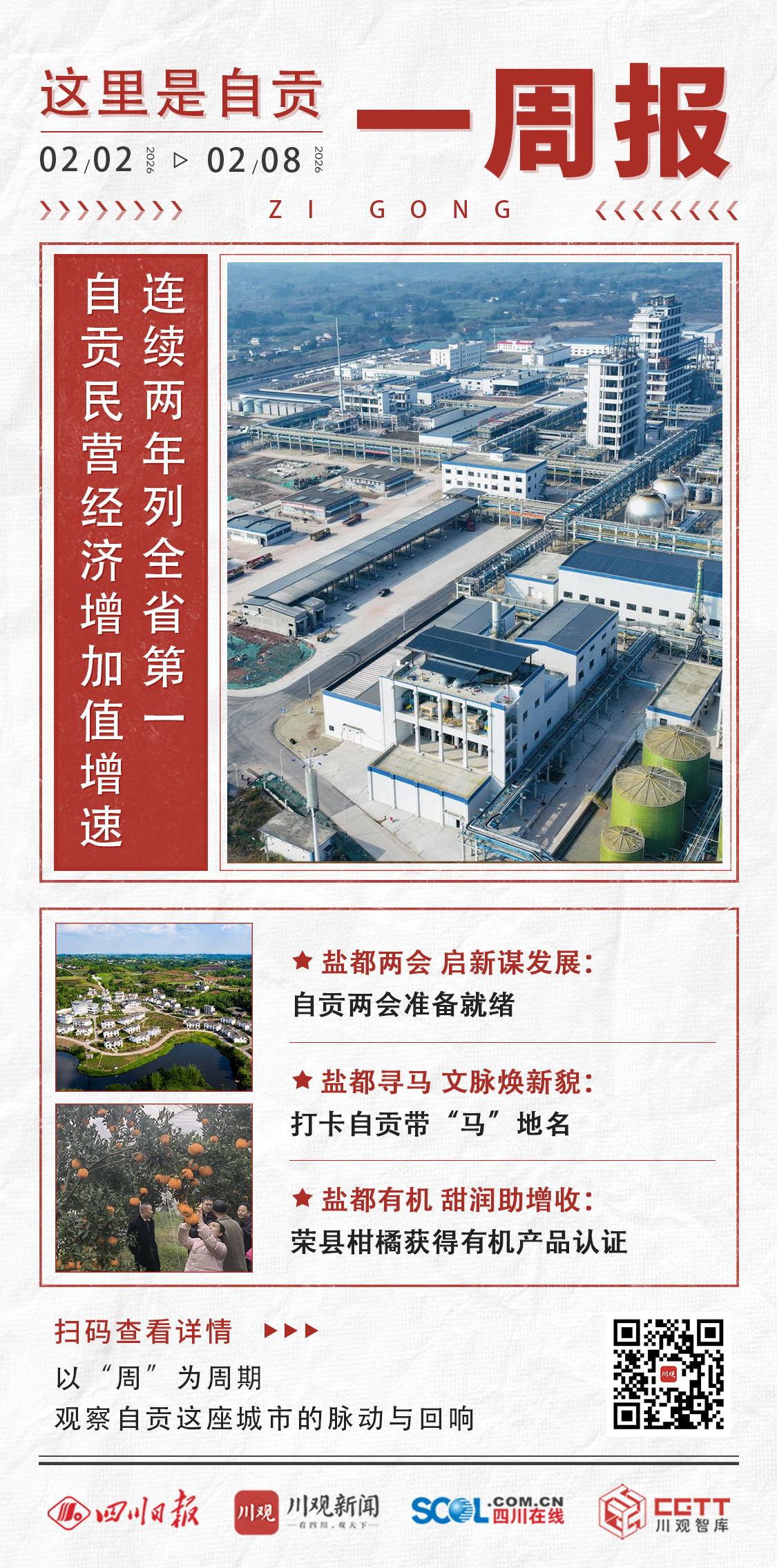 刚刚过去的一周(2月2日—2月8日),自贡多点发力、多点出彩,民营经济续写领跑佳绩,两会筹备有序推进,地名文化焕发新生,乡村振兴再添动能。
