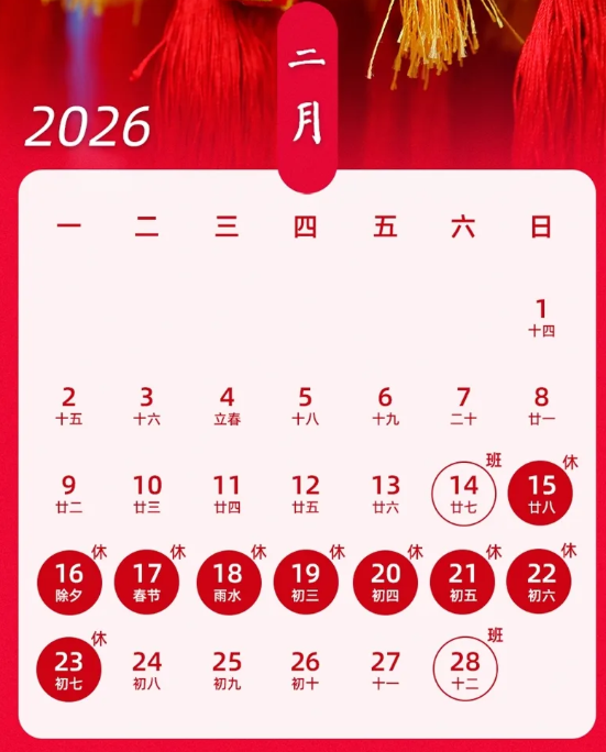 2月15日(农历腊月二十八、周日)至23日(农历正月初七、周一)放假调休,共9天。