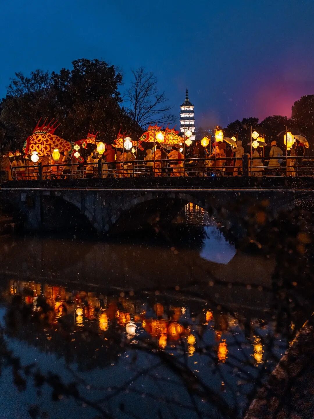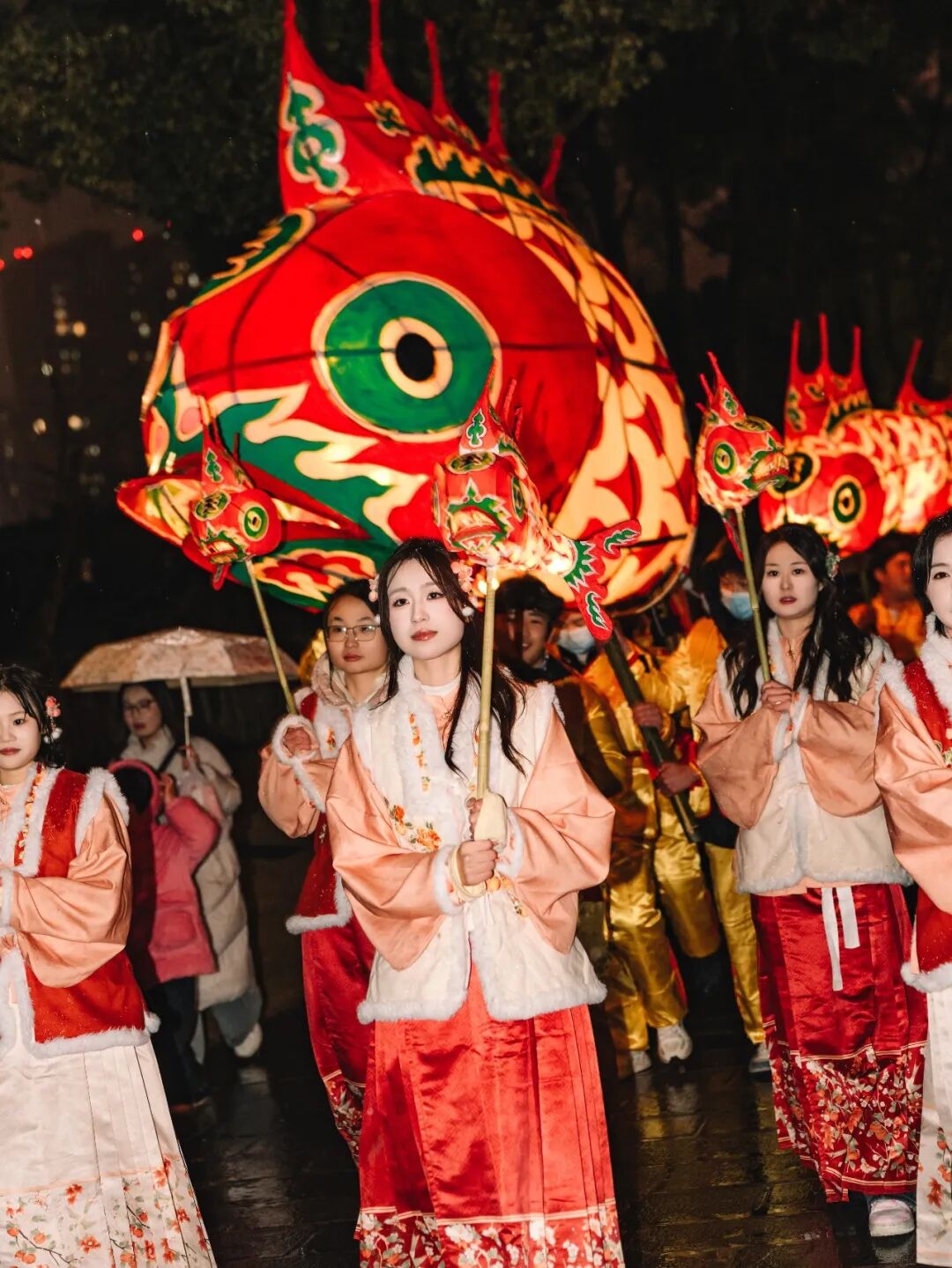 除了震撼人心的“火老虎”表演,广受市民喜爱的安徽省级非物质文化遗产“汪满田鱼灯”也再度点亮徽园夜色,为新春增添了浓郁的喜庆氛围。活动中,大小各异的鱼灯组成庞大巡游队伍,灯光流转、身姿灵动,展现了徽州民俗的精巧匠心,也寄托着市民对国泰民安、年年有余的美好期许。