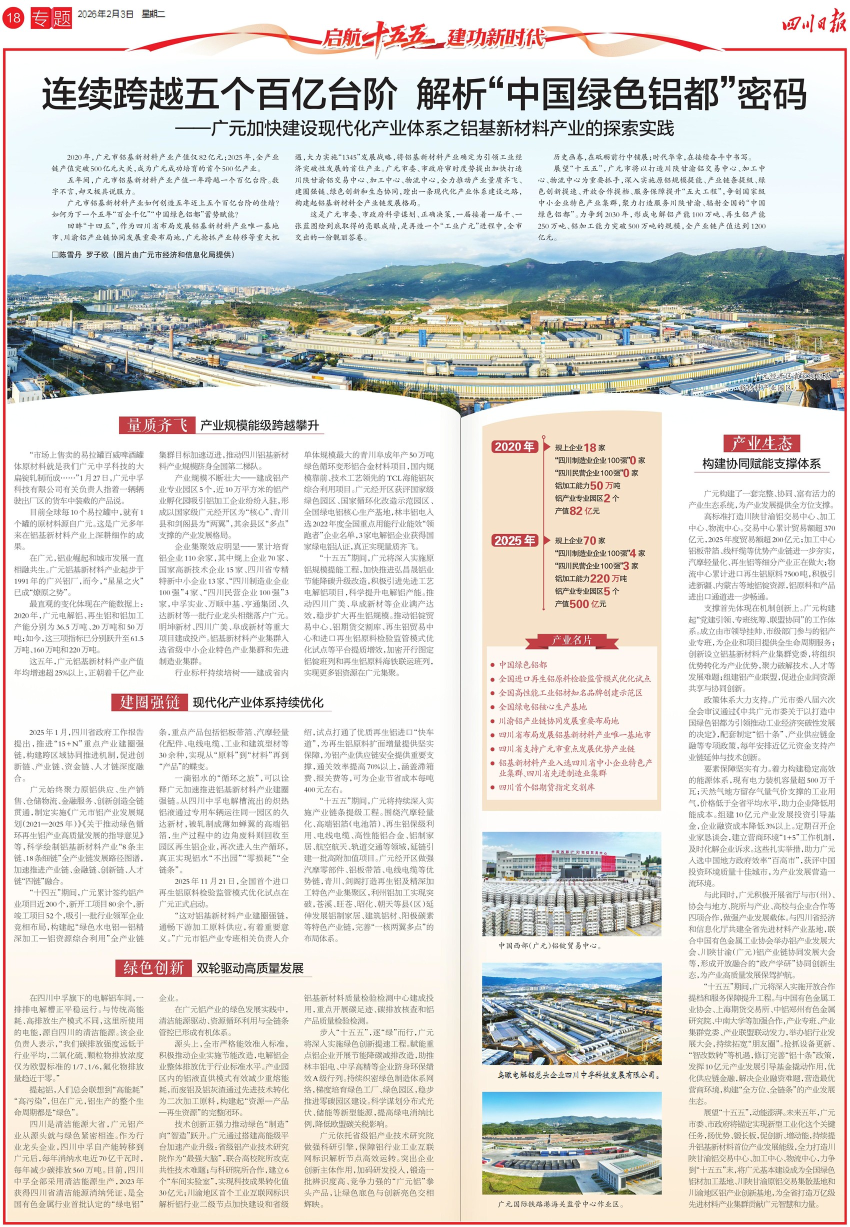 亮眼成绩的背后,是产业的坚实支撑。作为广元工业的首位产业,铝基新材料产业在“十四五”期间实现了跨越式发展:产值从2020年的82亿元,跃升至2025年的超500亿元,五年间连跨五个百亿台阶,成功培育为全市首个五百亿级产业集群。这一成就,源于广元抢抓机遇,将铝基新材料确立为首位产业,并坚定不移实施“1345”发展战略,通过建圈强链、绿色创新,蹚出了一条现代化产业体系建设之路,为“再造一个工业广元”奠定了坚实基础。