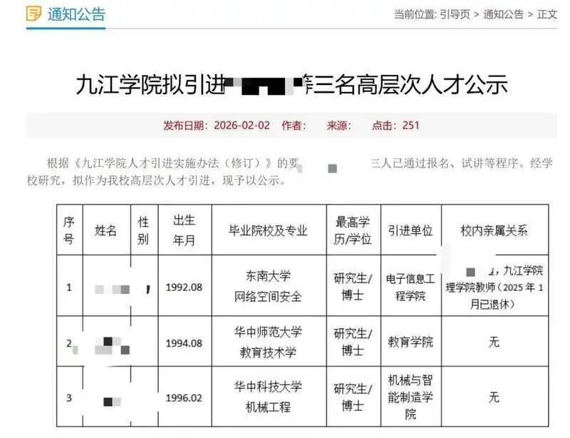 2月2日,九江学院发布一则拟引进三名高层次人才的公示,其中一名拟引进人才的父亲曾就职该校,九江学院对此亲属关系进行了公开公示。