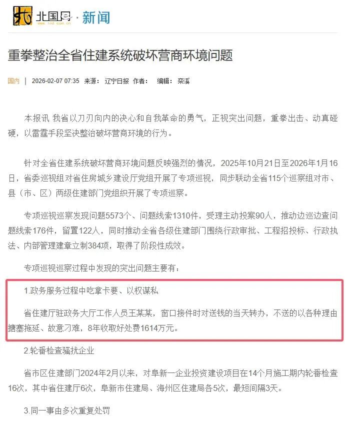 报道披露,针对辽宁省住建系统破坏营商环境问题反映强烈的情况,2025年10月21日至2026年1月16日,省委巡视组对省住房和城乡建设厅党组开展的专项巡视,同步联动全省对市、县(市、区)两级住建部门党组织开展专项巡察。该专项巡视巡察发现问题5573个、问题线索1310件,受理主动投案90人,留置122人。上述一事在专项巡视巡察过程中被发现,并被列为被发现的突出问题。