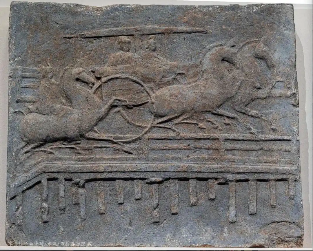 细看画面,只见两匹高大威风的骏马拉着一辆马车,正行到了一座桥上。这一刻,像被瞬间按下了时光快门,画面定格了近两千年。