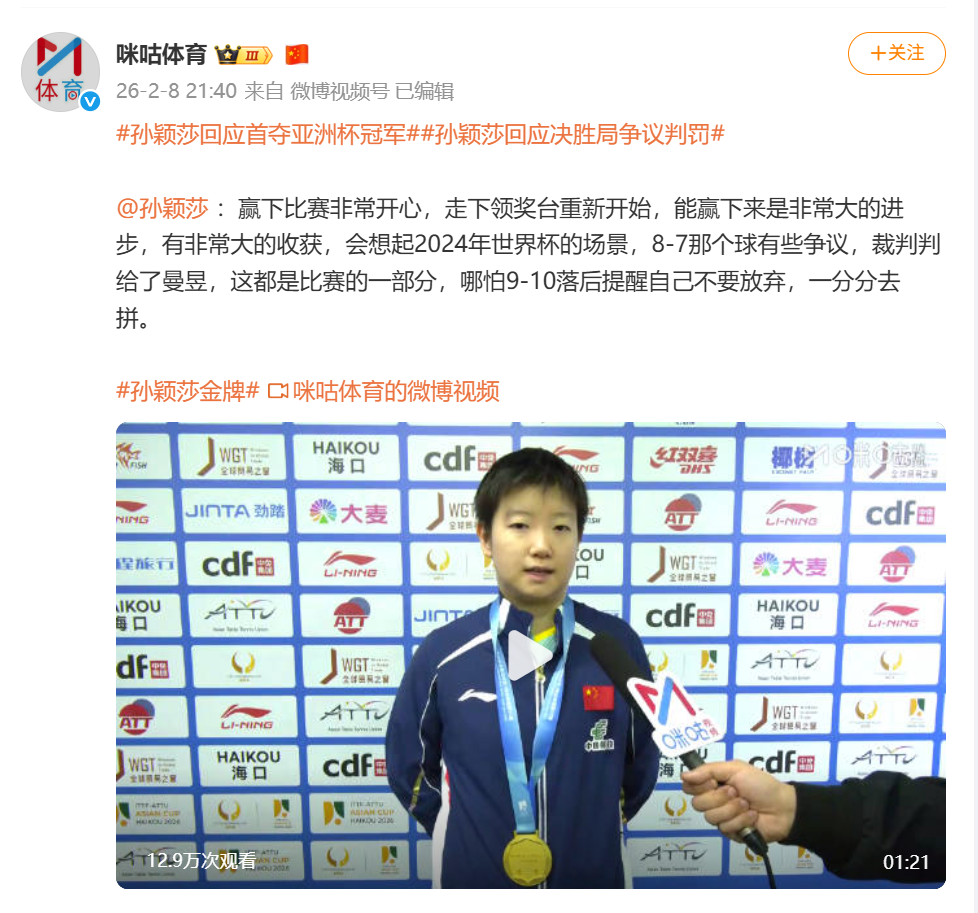 另据@咪咕体育 消息,孙颖莎回应决胜局争议判罚:“赢下比赛非常开心,走下领奖台重新开始,能赢下来是非常大的进步,有非常大的收获,会想起2024年世界杯的场景,8-7那个球有些争议,裁判判给了曼昱,这都是比赛的一部分,哪怕9-10落后也提醒自己不要放弃,一分分去拼。”