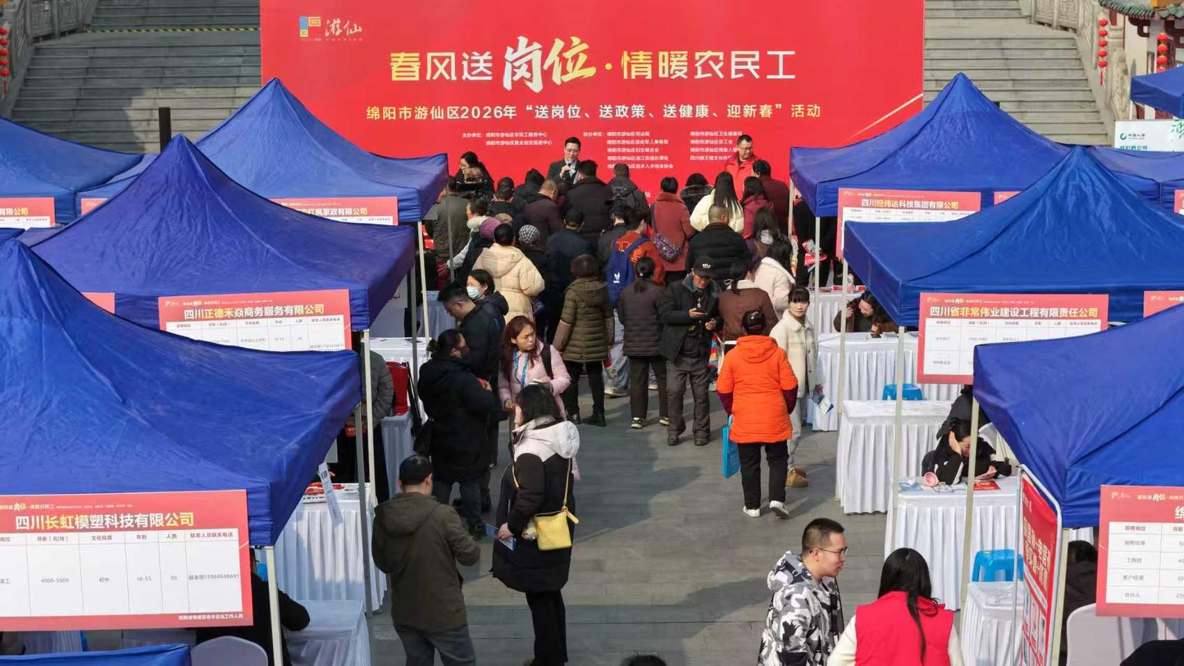 2月4日,绵阳市游仙区越王楼广场热闹非凡,春风送岗位· 情暖农民工——游仙区2026年“送岗位、送政策、送健康、迎新春”系列活动首场招聘会在这里开场。近百家企业携5000余个岗位集中亮相,种植养殖、技术操作、运营管理等多个类别全面覆盖,满足不同求职者的就业需求。