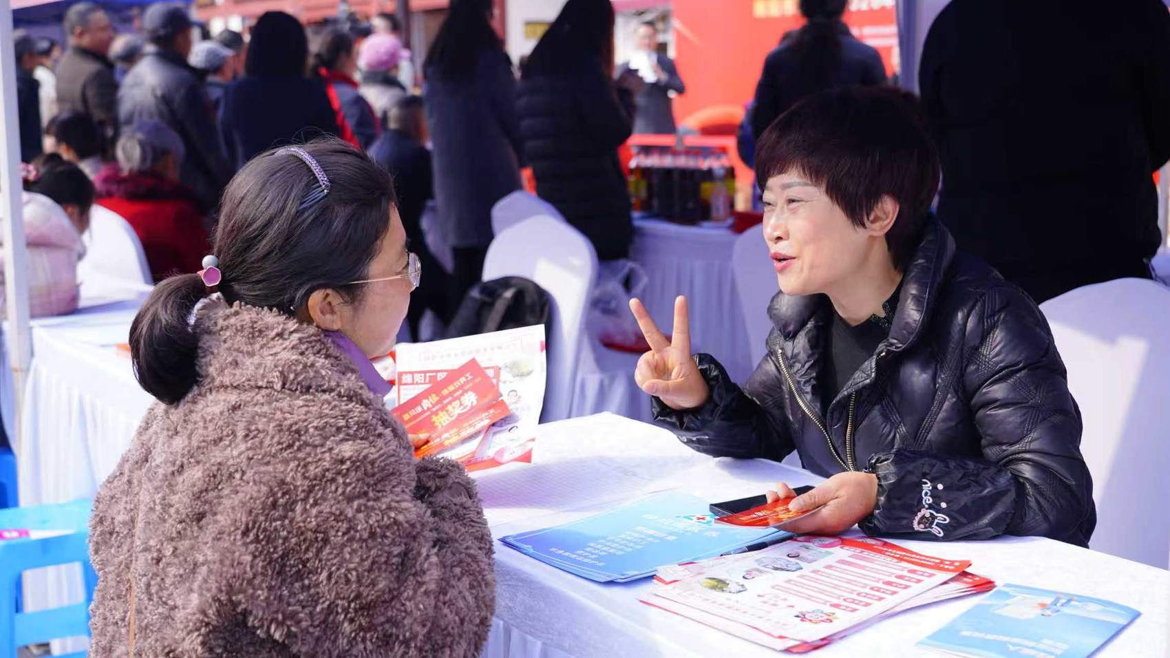 招聘会现场被划分成多个功能专区,就业招聘专区前尤为热闹。“我每天要接送孩子上下学,想咨询一下这份工作是否支持弹性工作制?”“这个技能岗不一定要看学历,技术过关是关键。”……绵阳双汇食品有限责任公司的招聘展位前围满了求职者,公司人力资源部部长赵喜妹一边接过求职者递来的简历,一边耐心解答:“我们主要招生产操作工、检验员,年前生产量较大有点缺人,可以选择年前入职,也是在为公司年后扩产做准备。”她手里的登记本留下密密麻麻的求职者信息。“今天效果不错,有四五十个人咨询,收到了十几份简历,线上线下都有留下联系方式的。”