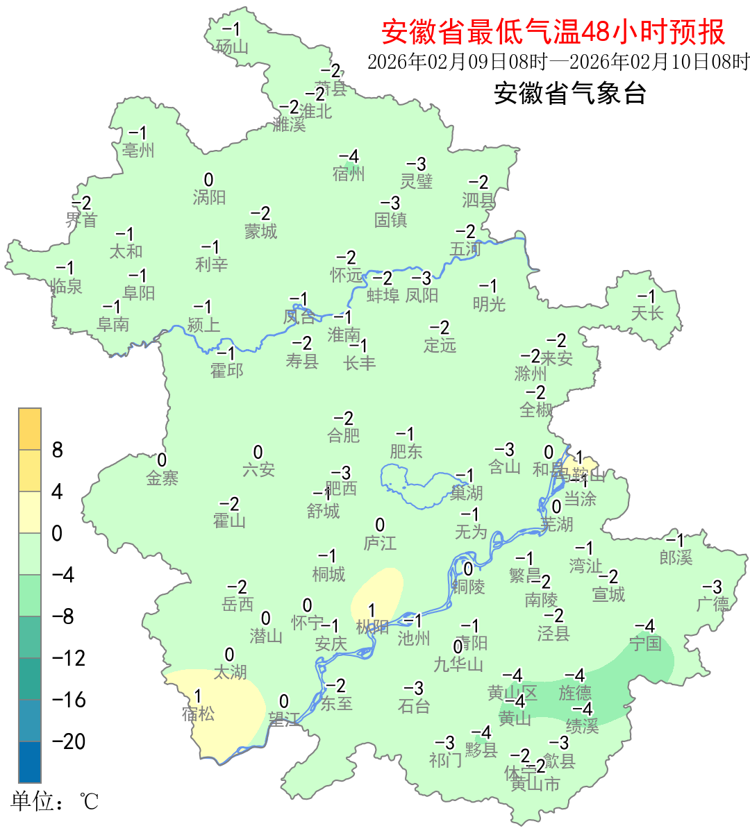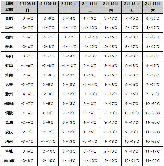 气温预报:今天早晨气温较低,淮河以北和本省山区最低气温-6~-4℃,其他地区-4~-2℃;今天后全省气温逐渐回升。