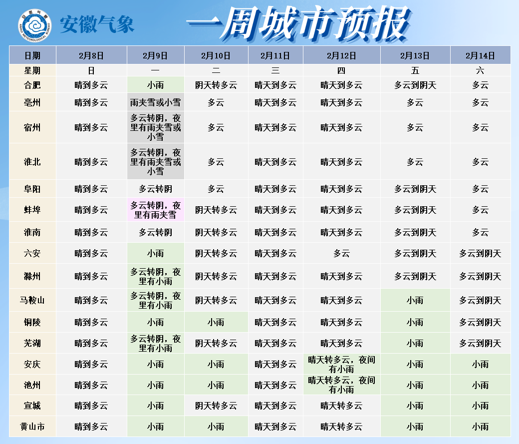 9日(周一):全省多云转阴天。淮河以北东北部有雨夹雪或小雪;淮河以南大部分地区有小雨,其中大别山区有雨夹雪。