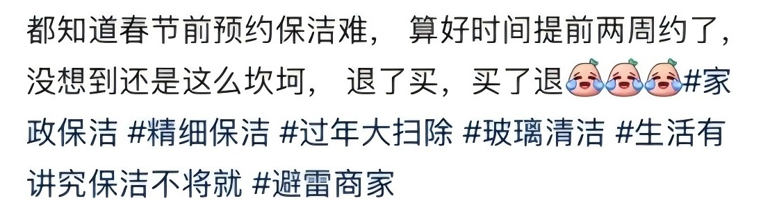 还有网友表示:自己预约的年前家政保洁订单被无故取消。