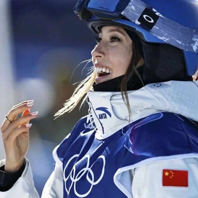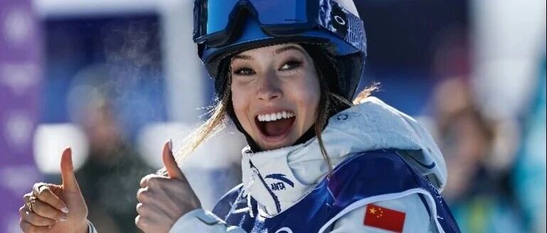 2月7日冬奥会坡面障碍技巧预赛上,谷爱凌在试跳后庆祝。图据新华社
