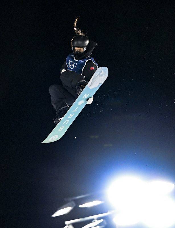 2月8日,中国选手张小楠在冬奥会单板滑雪项目女子大跳台预赛比赛中。图据新华社