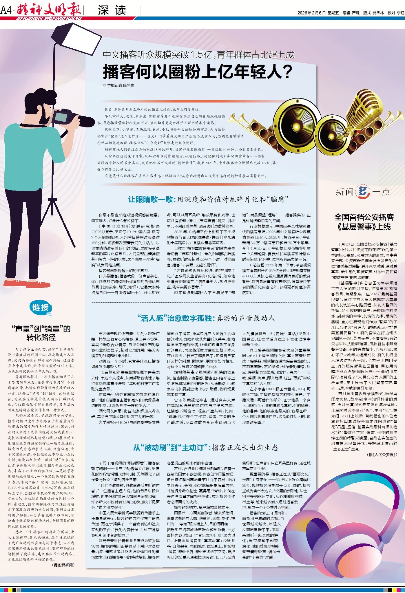 从时事政治到生活日常,从知识分享到情绪倾诉,从通勤路上的陪伴到做家务时的背景音……播客串联起年轻人的多重需求,成为他们不可或缺的“精神伙伴”。截至2025年,中文播客听众规模已突破1.5亿,其中青年群体占比超七成。