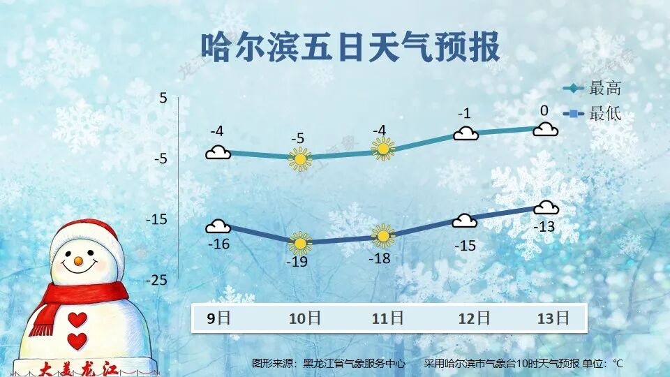 9日夜间最低气温:大兴安岭北部-31~-29℃,大兴安岭南部、黑河、伊春-26~-24℃,哈尔滨西部、七台河、鸡西、牡丹江-17~-15℃,其它地区-20~-18℃。