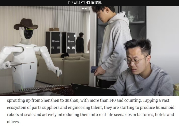 美国《华尔街日报》网站近日刊文称,中国机器人产业正蓬勃发展。从深圳到苏州,人形机器人企业如雨后春笋般涌现,目前已有超过140家且数量仍在持续增加。依托庞大的零部件供应链和工程师人才储备,这些企业已开始大规模生产人形机器人,并积极将其引入工厂、酒店及办公场所等现实场景进行应用。