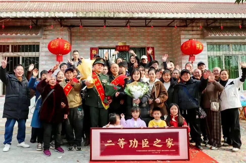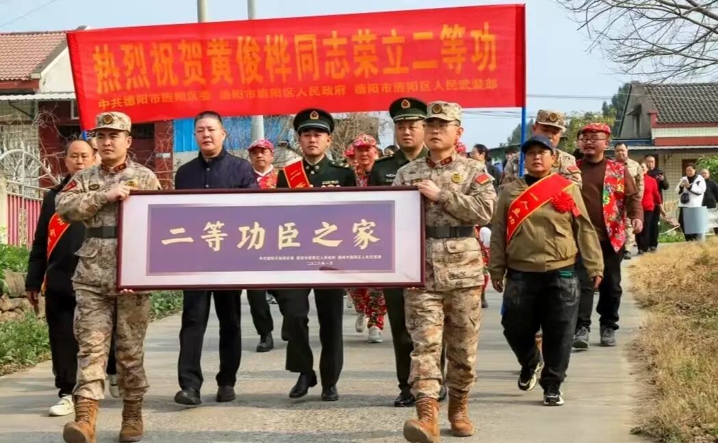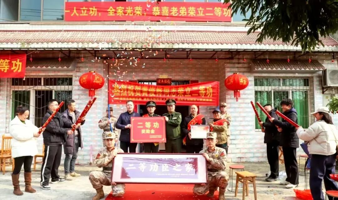2月5日下午,在德阳市旌阳区黄许镇东泰村,旌阳区退役军人事务局与旌阳区人武部组成的送喜报小分队将一份满载荣誉的二等功喜报、“二等功臣之家”牌匾送到了现役军人黄俊桦家中。