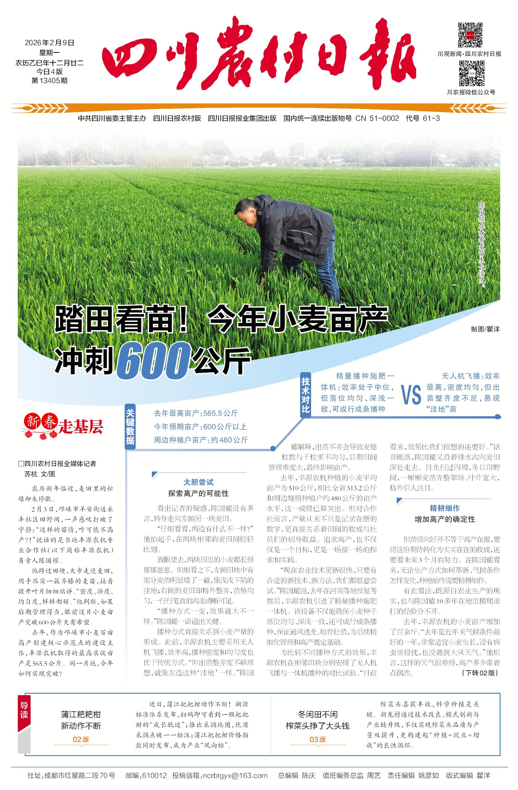 邛崃市羊安街道永丰社区田野间,丰源农机专业合作社负责人陈国耀跨过田埂,大步走进麦田,用手压实一簇齐膝的麦苗,接着拨开叶片细细端详。“密度、壮度、均匀度,样样都好。”他判断,如果后期管理得当,眼前这片小麦亩产突破600公斤大有希望。