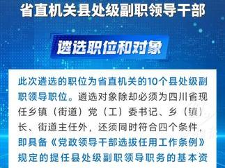 为深入贯彻习近平总书记关于激励干部担当作为的重要论述,落实省委《关于坚持“以实干论英雄、凭实绩用干部”进一步激励干部担当作为的意见》要求,日前,省委组织部发布《四川省省直机关面向优秀乡镇(街道)党政正职公开遴选县处级副职领导干部公告》,拿出10个省直机关副处级领导职位专门面向优秀乡镇(街道)正职开展公开遴选。