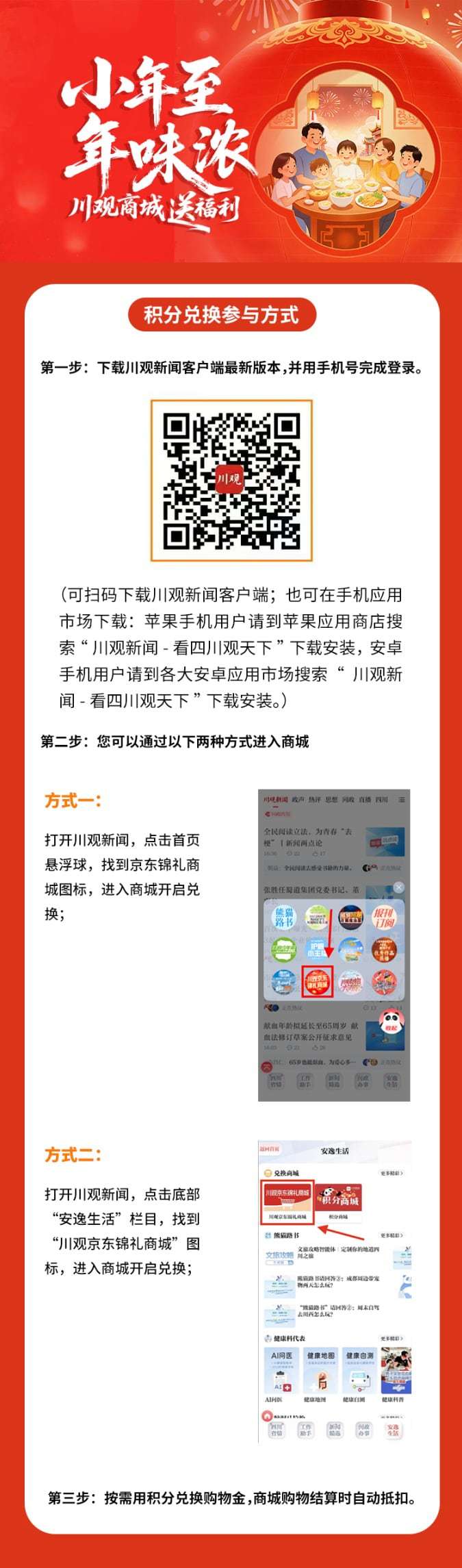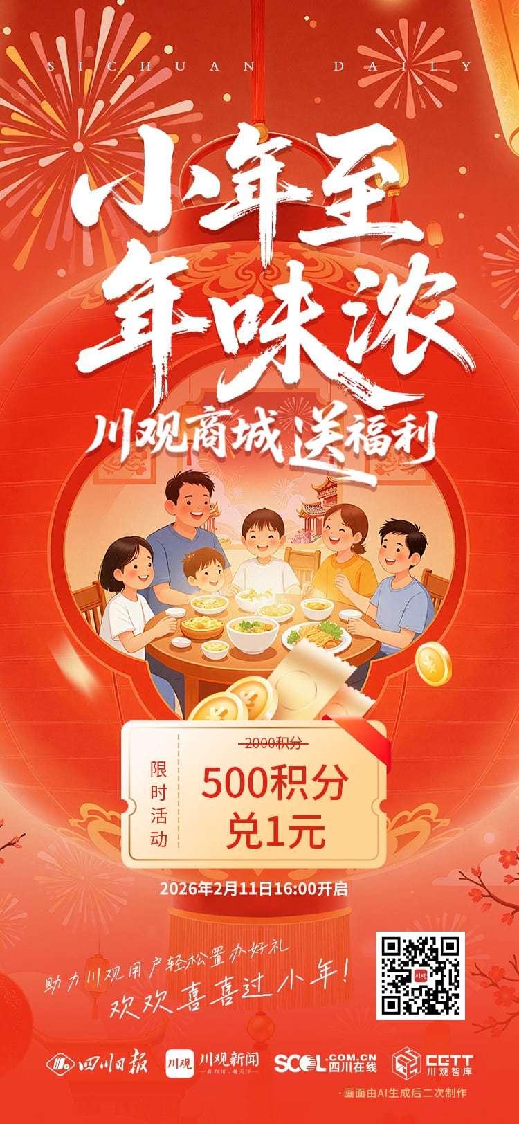 腊味飘香,迎新纳福,2月11日,南方小年夜这天,巴蜀大地到处都是浓浓的年味——烫火锅、备腊味、买年货,欢喜与热闹在街头巷尾氤氲。值此温馨时刻,川观京东锦礼商城暖心上线小年夜专属福利,商城积分兑换活动重磅开启,超值兑换比例来袭,500积分即可兑换1元购物金,让手中的积分秒变年货筹备金,助力各位川观用户备齐川味好礼,热热闹闹过小年!