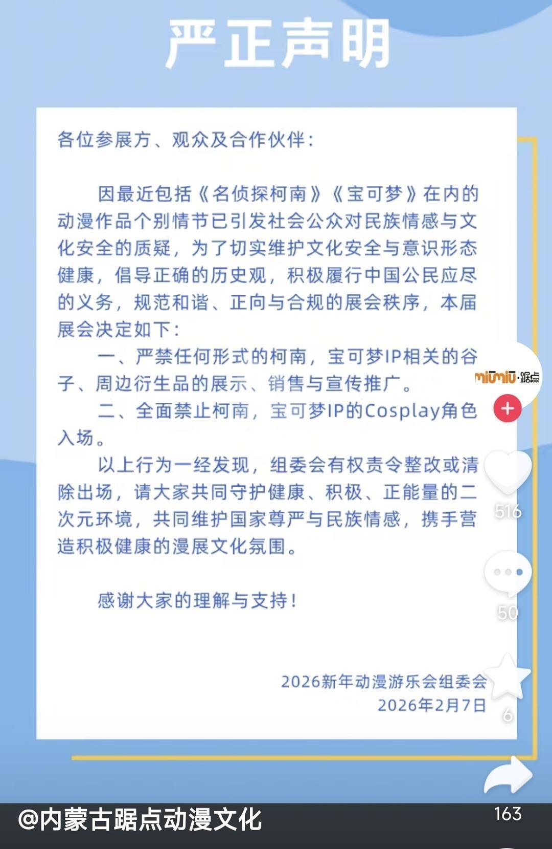 2026新年动漫游乐会发布声明禁止《名侦探柯南》《宝可梦》相关cosplay入场,以及周边衍生品销售。