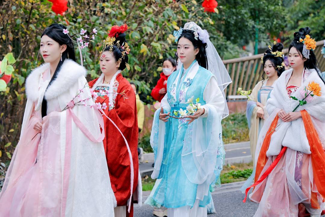 礼成之后,“花神巡礼·十里红妆”婚俗大巡游盛大开启。巡游队伍以花仙仪仗为先导,三对新人依次身着唐、宋、明制婚服,在“月老”“红娘”陪伴下,沿花乡主道徐徐行进。新人魏杨杨、张霁正是其中一对,谈及此次体验,他们难掩喜悦与感动:“这次传统婚俗体验让我们终生难忘,明制婚服仪式感拉满,每一个细节都是传统与创新的结合。真的很特别、很有意义!”