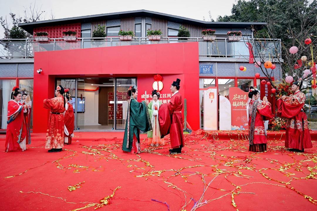 随后,在现场嘉宾与市民的共同见证下,“囍事堂”公园式婚姻登记点揭牌启用,标志着成都首个融合花乡生态与婚俗文化的主题婚姻登记场所正式投入运营。