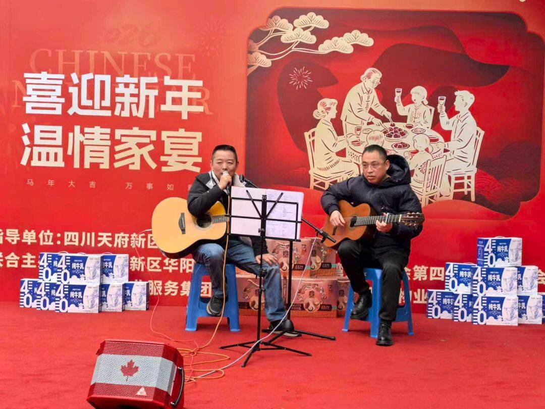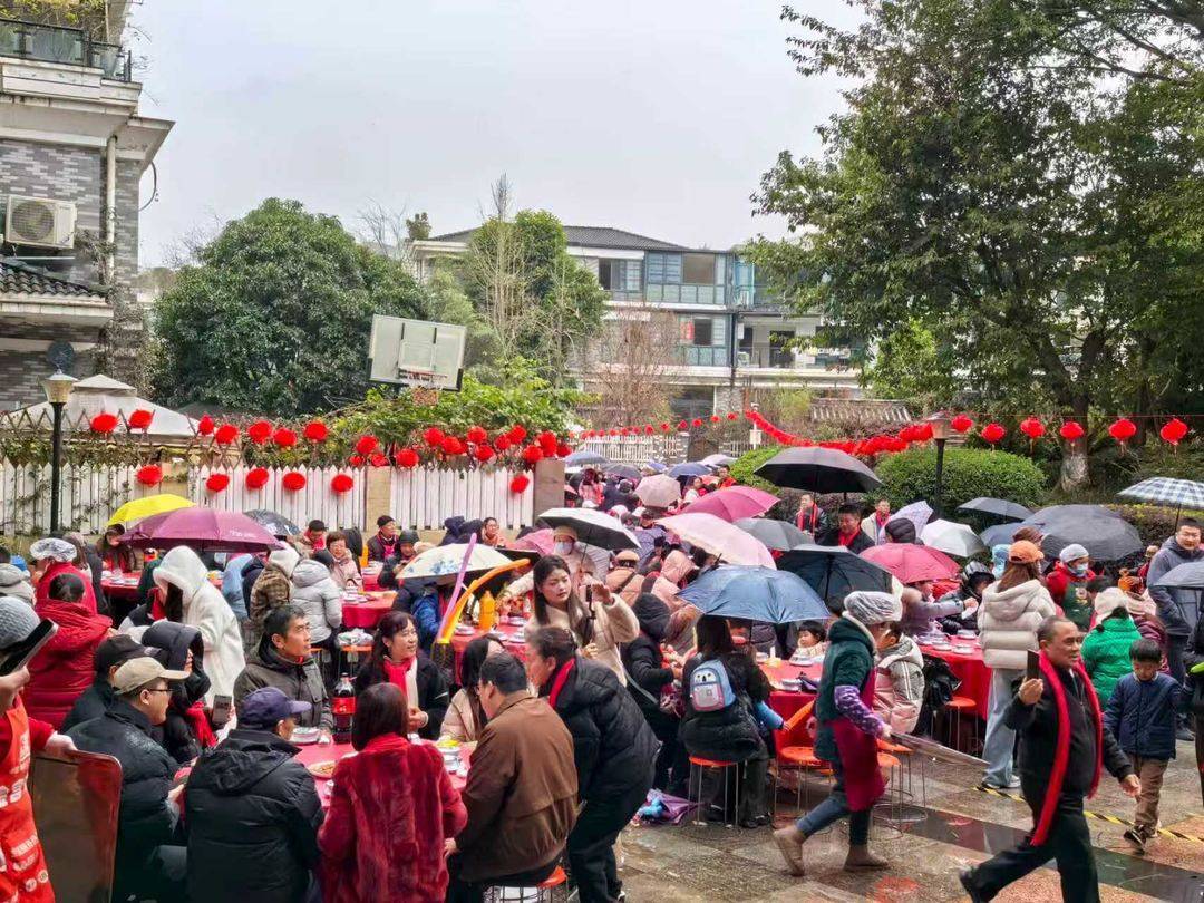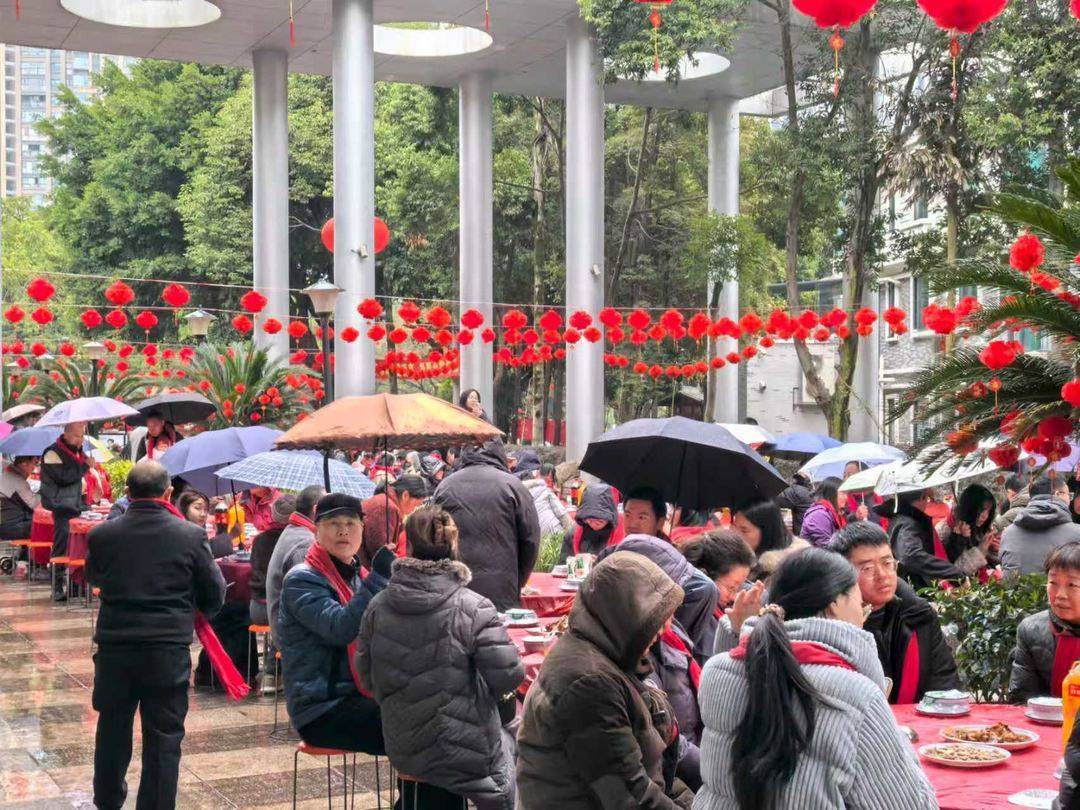 2月8日上午,四川天府新区华阳街道观音湾社区锦官丽城·亲水湾内一片热闹景象,主题为“喜迎新年 温情家宴”的千人坝坝宴在小区里热闹开席。天空虽然飘着零星小雨,却丝毫没有冲淡现场的热情,千余名业主代表欢聚一堂,共同迎接即将到来的马年新春。