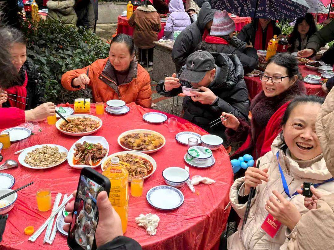“开席咯!”一声吆喝将活动推向高潮。邻里们纷纷落座,一道道极具川味特色的菜肴被端上桌,大家举杯相敬,为社区祝福,为情谊干杯。细雨中,露天摆开的宴席别有一番风味,邻里间相互关照、说说笑笑的场景,构成了冬日里一道特别的风景。一位老人被几位年轻邻居细心安排在避风的位置,“有这么多邻居一起,过年一点也不冷清,心里特别热乎。”,他感慨地说道。