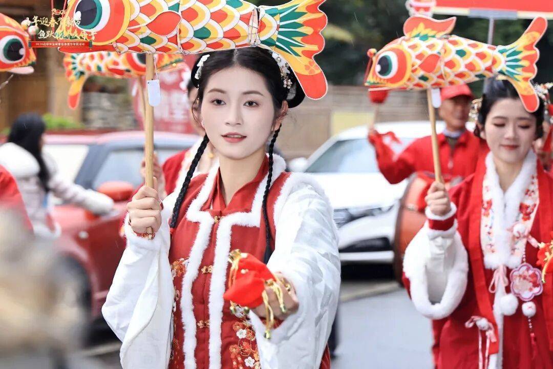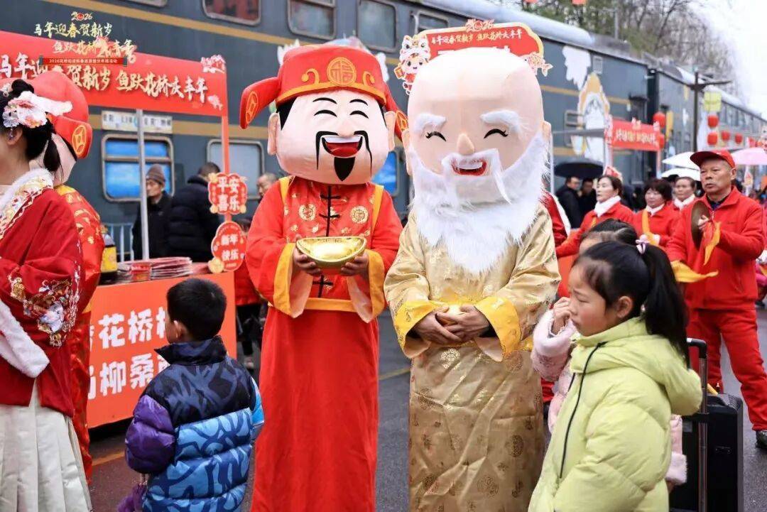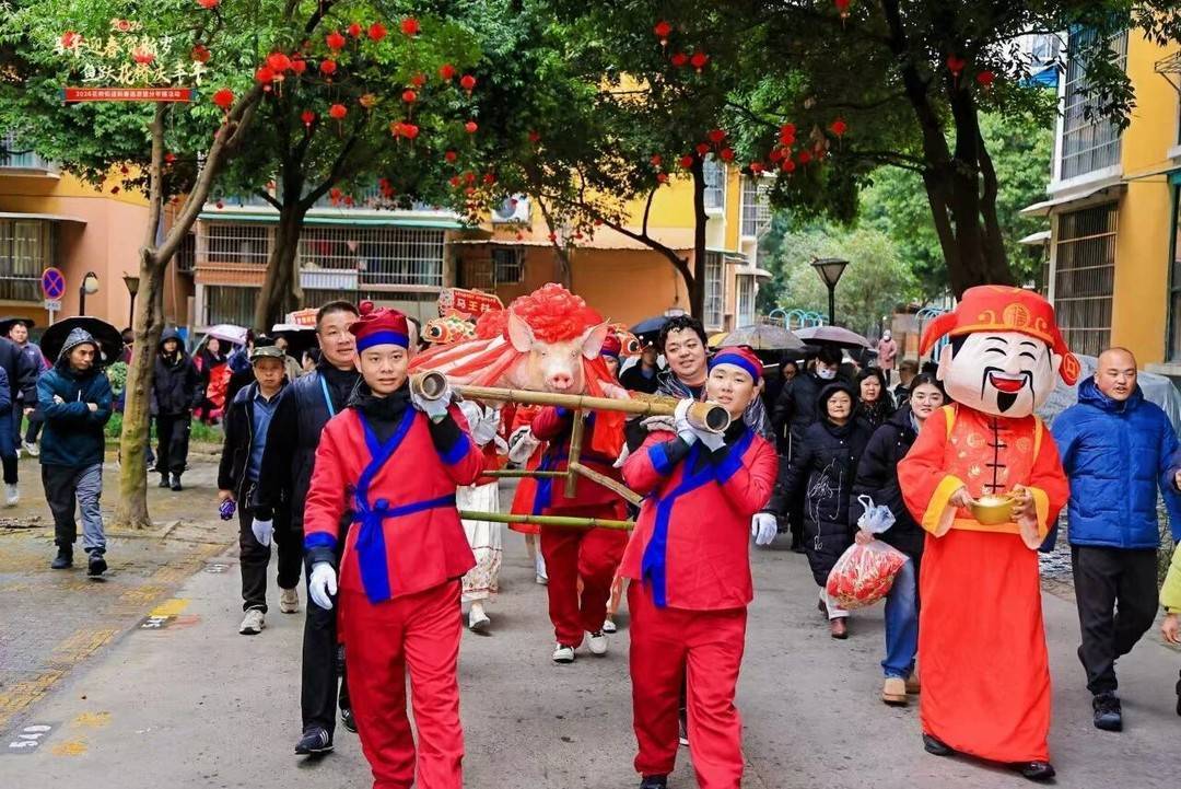 新春大巡游在棉花沱小区正式启动。驿路商队抬着年猪开道前行,重现古代商旅繁忙场景;福禄寿三星沿途发糖送福,传递新春祝福;蚕娘手持鱼灯翩翩起舞,展现非遗魅力;腰鼓舞龙队气势如虹,引来阵阵喝彩。