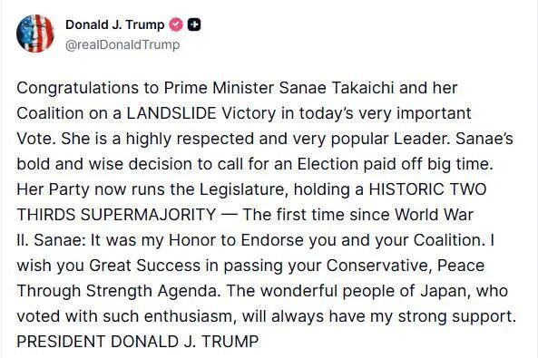 据中国新闻网综合外媒报道,当地时间2月8日,美国总统特朗普发文,对高市早苗以及由日本自民党和日本维新会组成的执政联盟,在当天举行的日本众议院选举中获得过半数议席,表示祝贺。