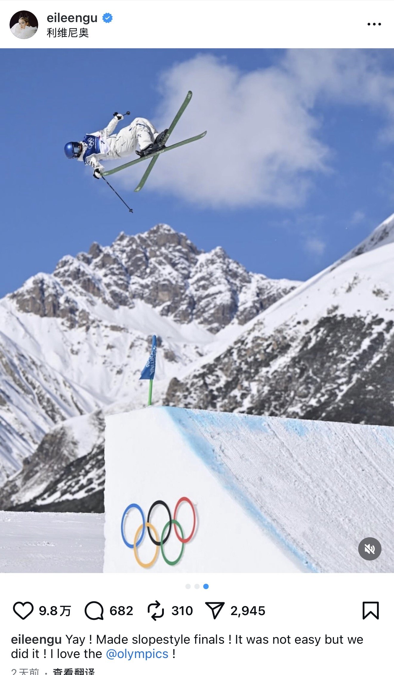 谷爱凌跻身坡面障碍决赛 图据谷爱凌社交平台