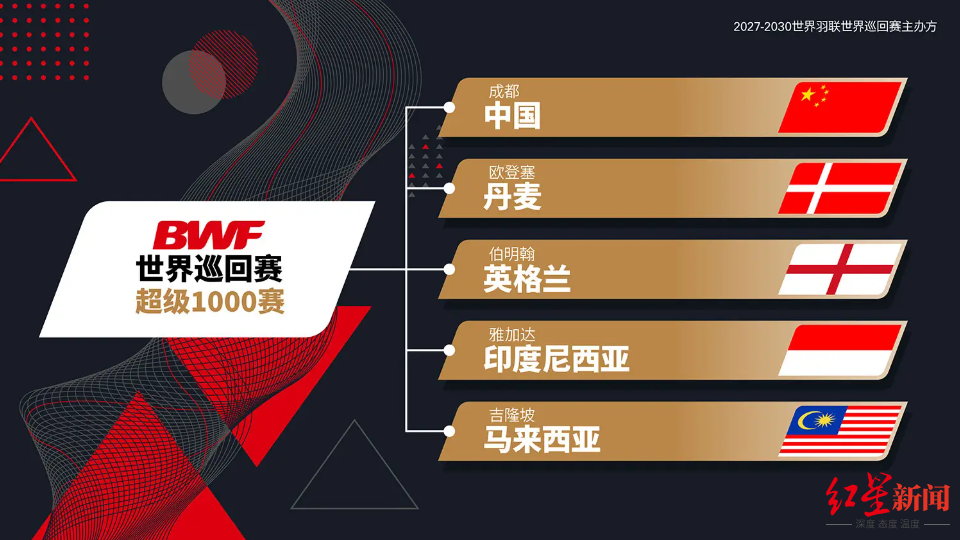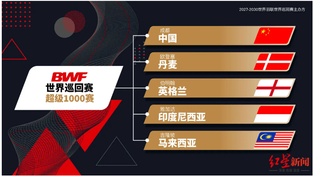 世界羽联于2025年在全球范围启动了2027-2030全新周期的世界巡回赛申办工作。中国羽毛球协会在2025年9月同时启动申办工作,面向全国公开征集第2级别至第6级别赛事意向申办城市。经过意向申办城市提交材料,中国羽协成立评审小组进行评分等阶段。经报国家体育总局审批,中国羽协在2025年10月31日发布公告,正式公示了成都市为2027-2030年世界羽联巡回赛超级1000赛事的申办城市。据记者了解,在公示后,中国羽协按照世界羽联申办程序,向世界羽联申办相应赛事。