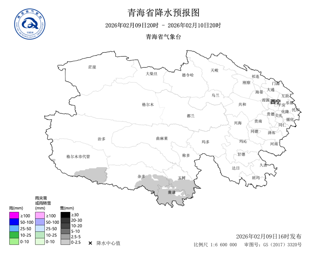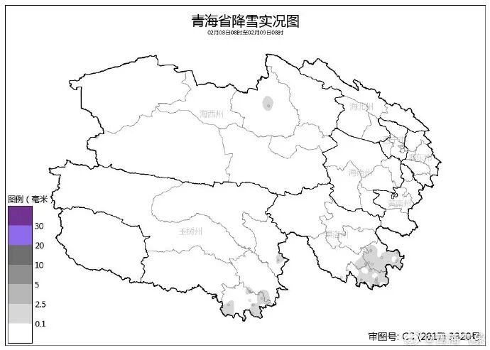 2月8日08时至2月9日08时,全省有27个站点出现降水,日平均降水量为0.3毫米,各地降水量在0.1~1.0毫米之间,其中小雪27站次。最大降水量出现在囊谦白扎乡尕尔寺,降水量为1.0毫米;城镇未出现降水。