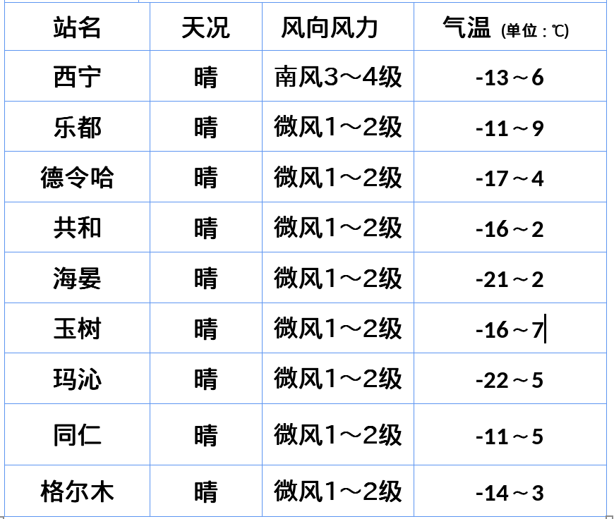 预计今天夜间,全省各地晴或多云。明天白天,唐古拉山区及杂多、玉树市、囊谦的部分地区有小雪或阵雪(0.1~1.0毫米),省内其余地区晴或多云。
