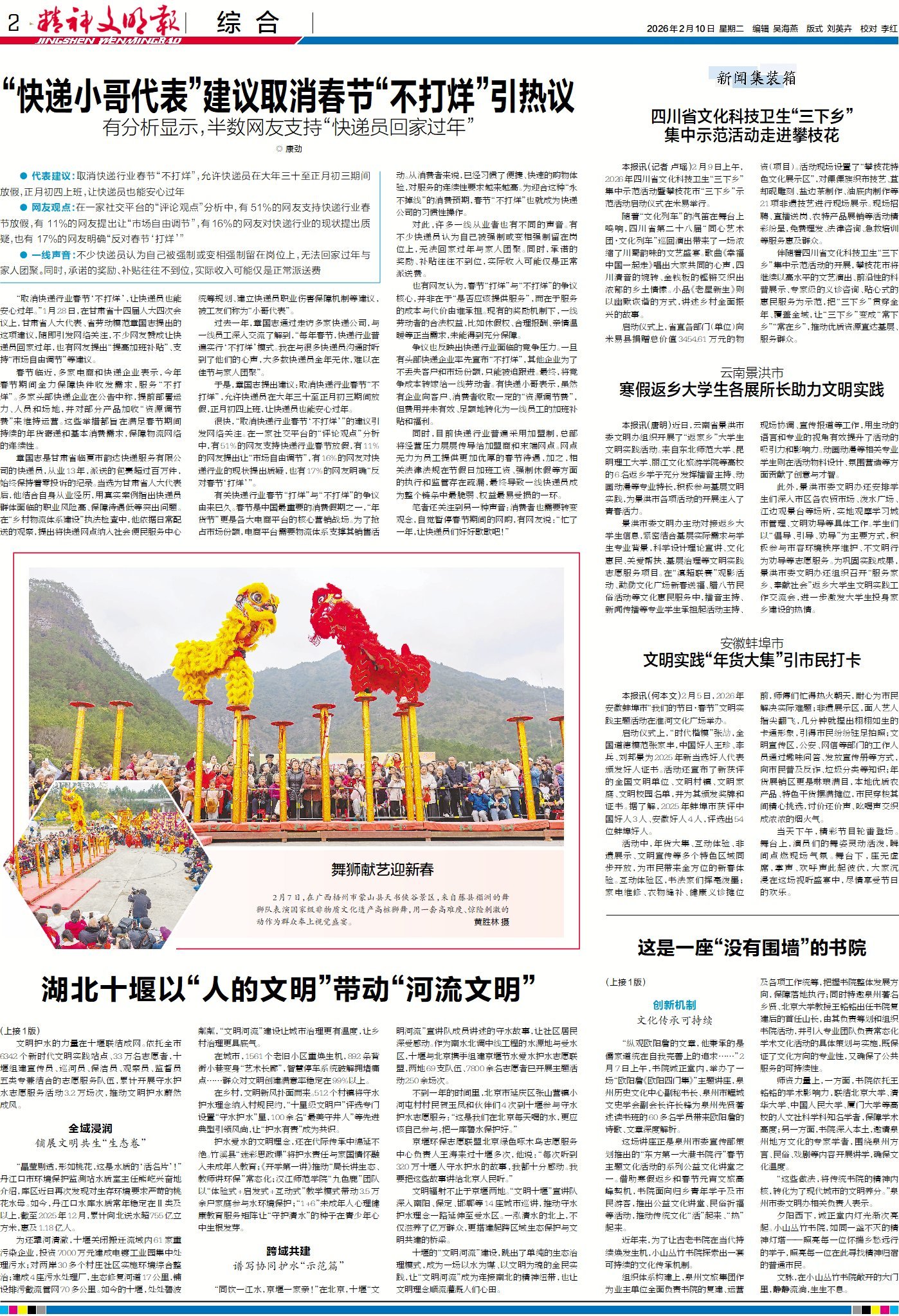 “取消快递行业春节‘不打烊’,让快递员也能安心过年。”1月28日,在甘肃省十四届人大四次会议上,甘肃省人大代表、省劳动模范章国志提出的这项建议,随即引发网络关注,不少网友赞成让快递员回家过年,也有网友提出“提高加班补贴”、支持“市场自由调节”等建议。到今日2版看详情。