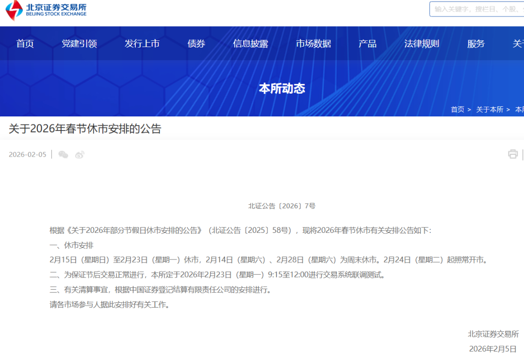 2月5日,北交所发布“关于2026年春节休市安排的公告”: