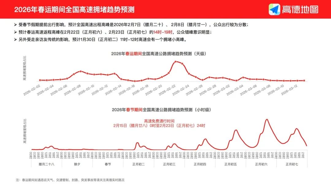 根据高德发布的《2026年春运出行预测报告》(以下简称《报告》),今年春运出行将呈现节前节后“双高峰”形态。节前出程高峰预计在2月7日、2月8日(腊月二十、腊月二十一),而节后返程高峰则预计出现在2月22日、2月23日(正月初六、初七)下午。此外,受传统走亲访友习惯影响,正月初二(2月18日)中午时段或将出现短暂的拥堵小高峰。