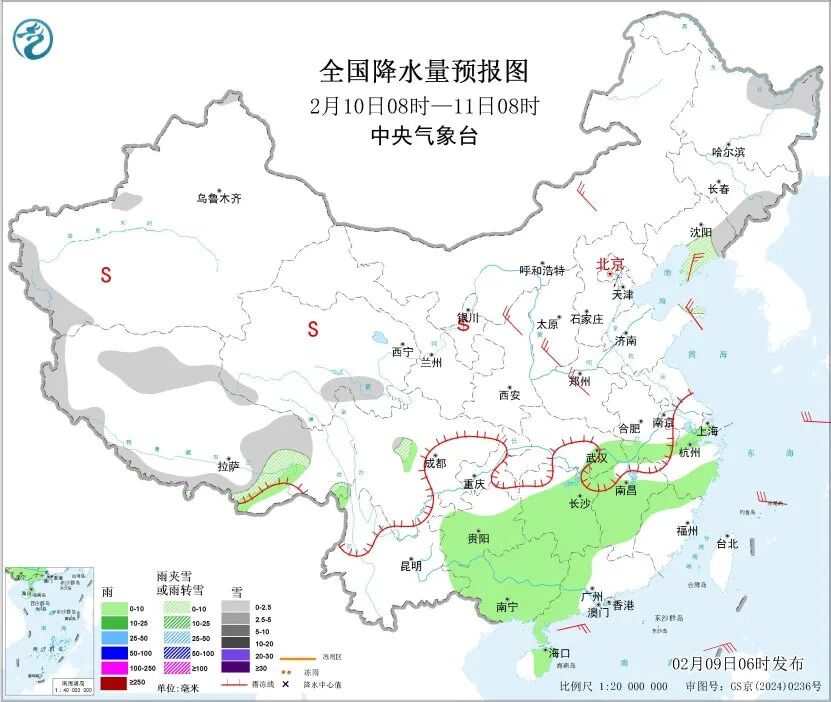具体来看,2月9日8时至10日8时,新疆西北部、西藏东北部和南部、青海北部、甘肃河西、山西中南部、山东大部、湖北西部、湖南西北部、重庆东北部等地部分地区有小雪或雨夹雪,局地有中雪;贵州东北部、湖南西部等地高海拔山区有冻雨。江汉东部、江淮、江南及重庆东南部、贵州大部、广西中部和北部、云南南部、海南岛东部、台湾岛东部等地部分地区有小雨。