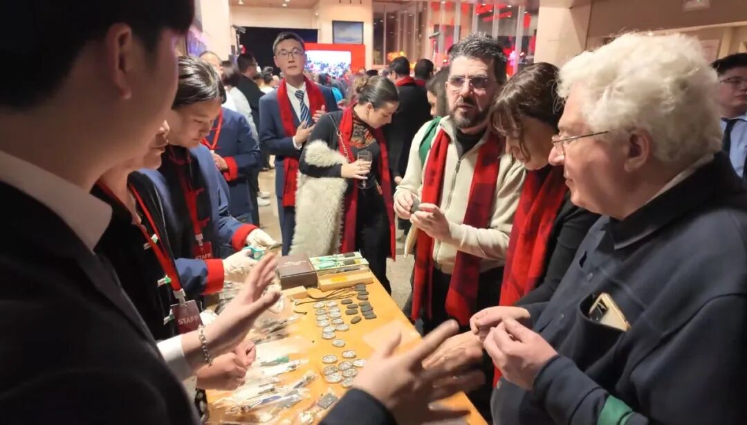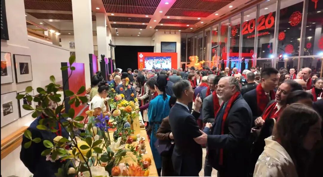 活动现场充满着浓浓的年味——玻璃窗上张贴着“欢乐春节”主题的红色剪纸,机器人挥毫书写“福”字,嘉宾们共同点亮象征吉祥的“吉祥马”彩灯……每一处装饰都洋溢着新春的喜悦。嘉宾们穿梭于美食和非遗展台间,细细品尝中西风味,参与茶艺、插花等非遗项目体验。非遗与节庆在此交织,宛如一幅温暖生动的文明对话画卷。