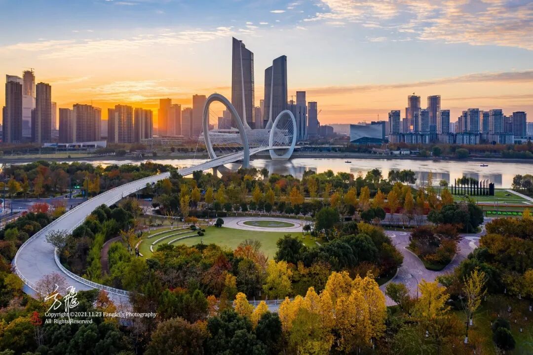 “观城览江”打卡地作为公园的 “极目佳处”,向东可赏草地球场、池杉森林、河西CBD的天际与落日交相辉映;向西可览五桥风光、江北新城与百里老山全景,南京的“山水城林”尽收眼底。