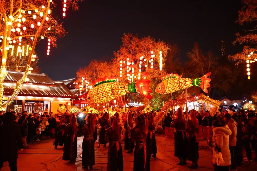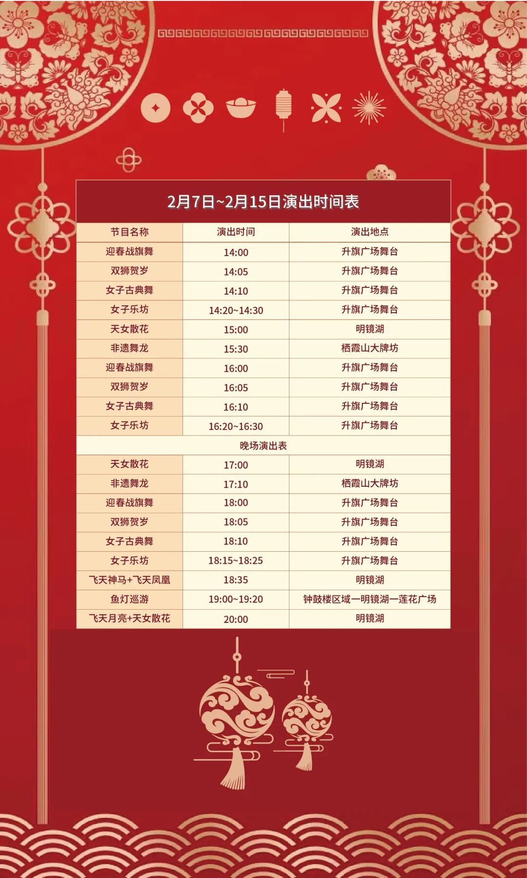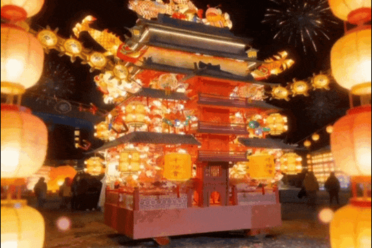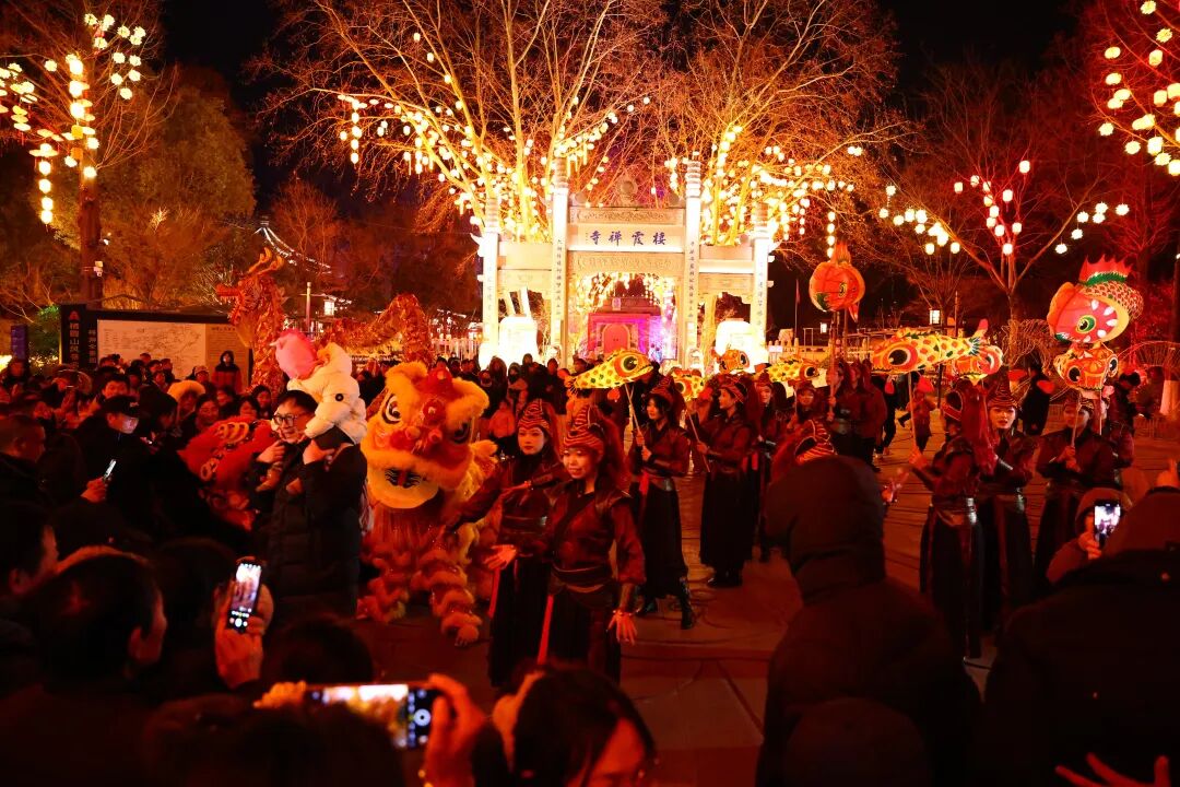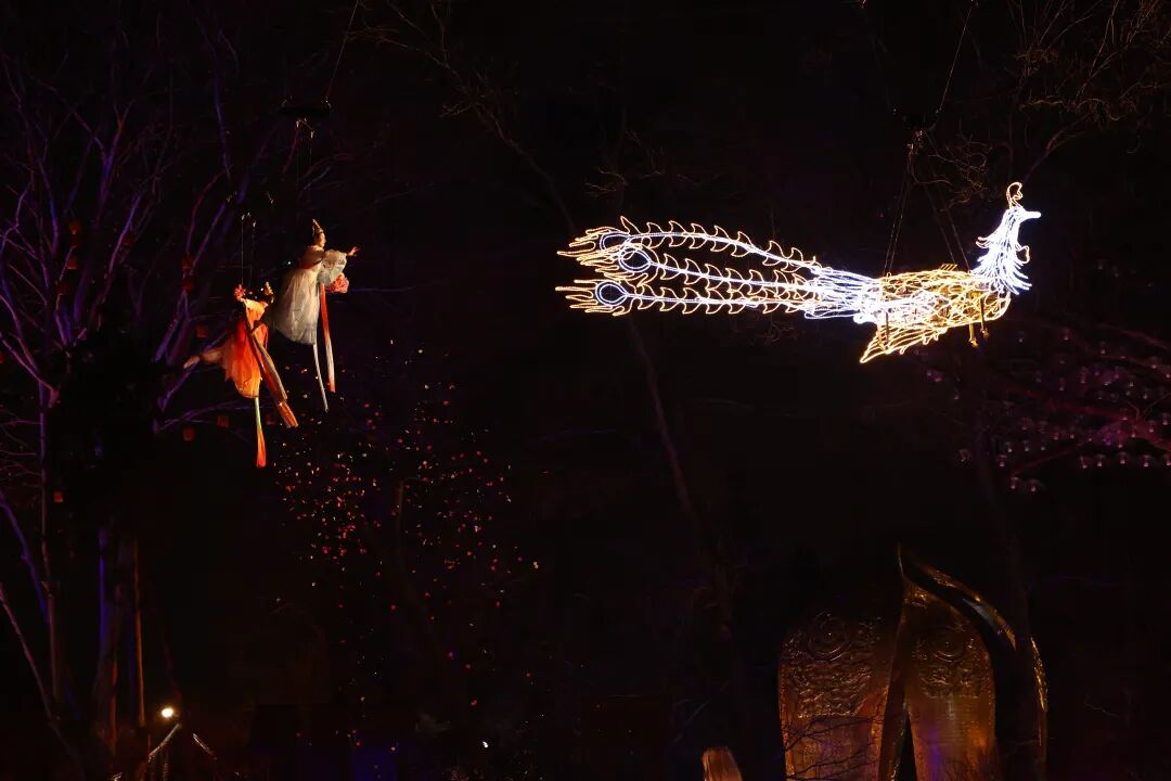 现场,不少市民游客举家前来,在流光溢彩中提前感受新春的热闹与温馨。家住栖霞街道的周女士特意带着六岁的儿子前来“尝鲜”。“听说今晚亮灯,孩子吃完晚饭就催着出门。”她牵着兴奋不已的孩子,笑着对记者说,“今年在家门口就能看到这么壮观的花灯,还有传统的舞龙表演和创意十足的飞天秀,一下子就有过年的感觉了。”