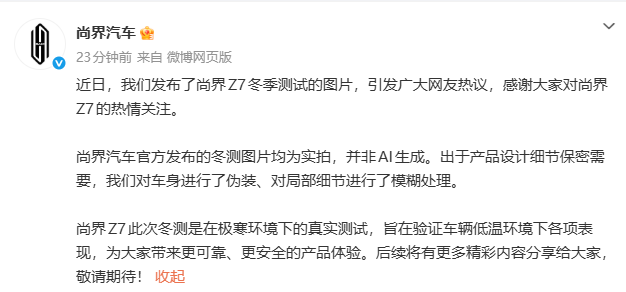 近日,有网友质疑“尚界发布的Z7冬测图片为AI图”,官方图片中车辆轮毂处于高速转动状态,而轮胎表面纹理清晰。