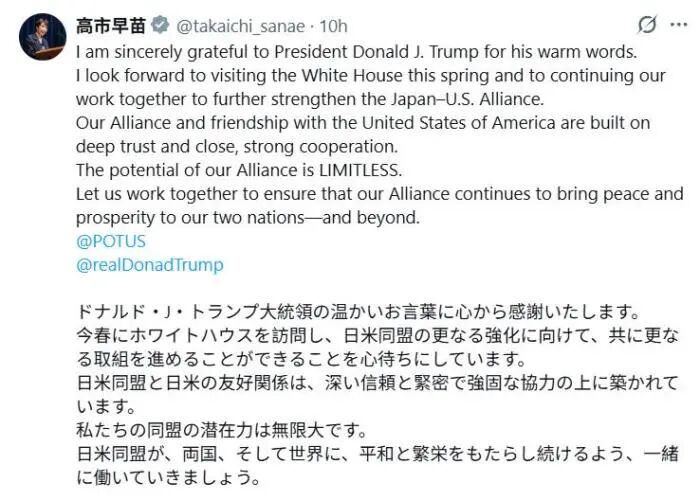 当地时间8日,高市早苗在社交平台X上用日英双语发文,对特朗普的发声表示感谢。她写道,“我衷心感谢总统特朗普的亲切致辞,并期待着今年春天访问白宫。我将继续与特朗普总统共同努力,进一步巩固日美同盟。”高市早苗认为,“日美的同盟关系与友谊是建立在深厚信任及紧密牢固合作基础之上的”。