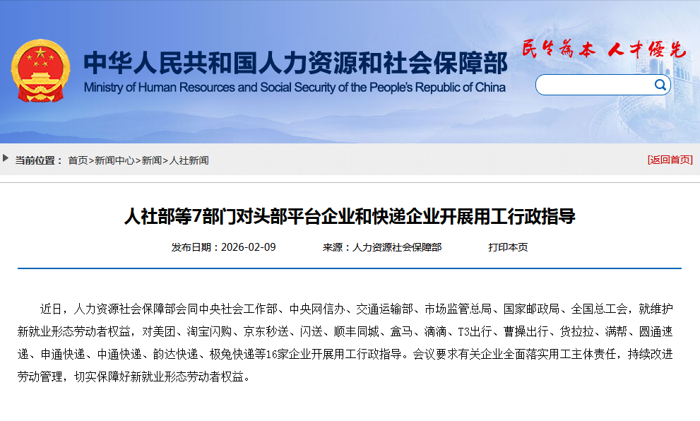 近日,人力资源社会保障部会同中央社会工作部、中央网信办、交通运输部、市场监管总局、国家邮政局、全国总工会,就维护新就业形态劳动者权益,对美团、淘宝闪购、京东秒送、闪送、顺丰同城、盒马、滴滴、T3出行、曹操出行、货拉拉、满帮、圆通速递、申通快递、中通快递、韵达快递、极兔快递等16家企业开展用工行政指导。会议要求有关企业全面落实用工主体责任,持续改进劳动管理,切实保障好新就业形态劳动者权益。